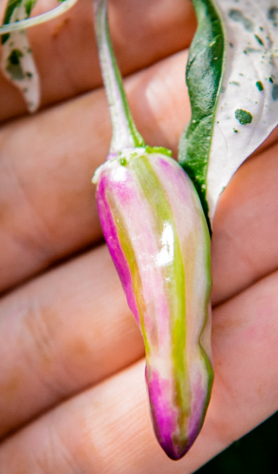 نقدم لكم صنفًا جميلًا وغير مألوف بتنوع أبيض مذهل على ثماره وأوراقه! (نبته مبرغشه ) يُظهر هذا الفلفل الحار الفريد عرضًا ساحرًا من الألوان الأرجوانية والوردية والخضراء والبيضاء التي تُزين ثماره الرائعة أثناء نضجها. وأخيرًا، تتحول الثمار إلى اللون الأحمر الداكن، مما يُضفي تباينًا جذابًا على أوراقها المتنوعة. هذا النبات المدمج ليس مذهلًا بصريًا فحسب، بل يتميز أيضًا بنموه الاستثنائي، بهيكله الكثيف الذي يجعله قطعةً مميزة في أي حديقة أو فناء. بالإضافة إلى جاذبيته الزخرفية، فإن ثماره مناسبة ومتعددة الاستخدامات للطهي، وهي مثالية لمن يستمتعون بجمال ومذاق أصناف الفلفل الحار المتوسطه . هذا الصنف إضافة استثنائية لأي جامع أو مزارع منزلي يبحث عن شيء مميز – فهو مدمج، وملون، وغني بالنكهة والحرارة!